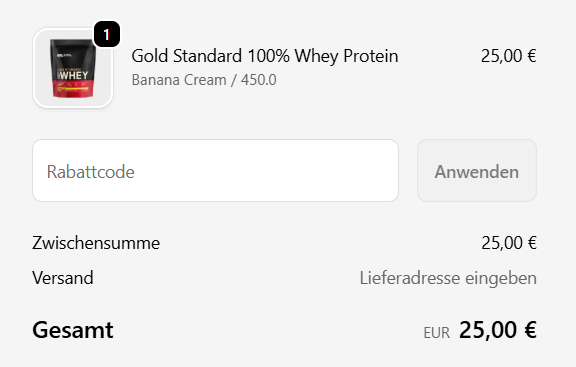 Wenn der Code gültig ist, wird dein Rabatt automatisch im Gesamtbetrag deiner Bestellung vor der Zahlung angezeigt.